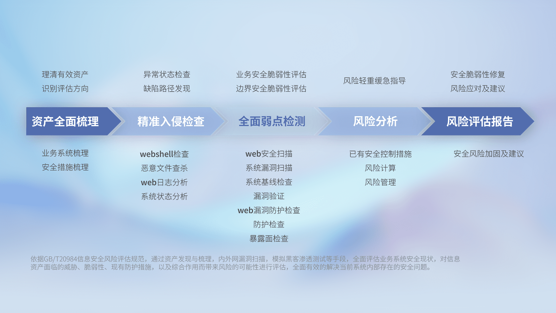 针对客户行业特性,,,,以专业的安全服务+多厂商联合解决方案提供专属的一站式安全管理服务,,,帮助客户全面感知网络空间威胁,,,基于识别、、检测、、、、分析、、、防护、、监测、、、响应的服务理论模型,,从方案咨询、、、集成交付、、、、评估验证、、、、优化加固、、、运维运营,,,,致力于为客户提供完整的闭环管理式安全服务。。。。以实战经验为客户打造高抵御风险的安全体系,,帮助客户发现威胁、、、对抗威胁、、处置威胁,,不断积累安全对抗能力,,,持续保障数字化安全。。